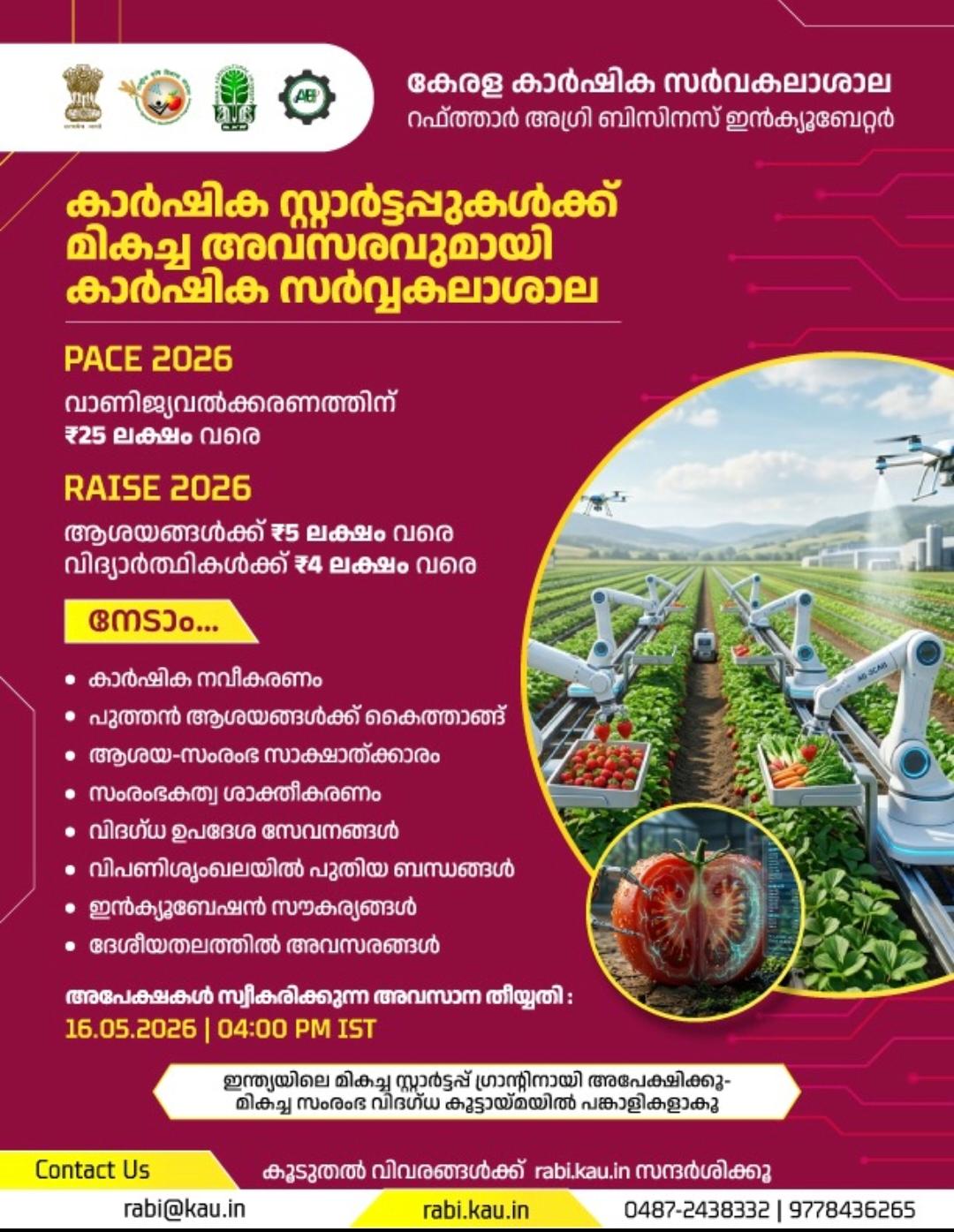 കാർഷിക സ്റ്റാർട്ടപ്പുകൾക്ക് അവസരം: KAU RABI 2026 പദ്ധതിയിലേക്ക് അപേക്ഷ ക്ഷണിച്ചു.